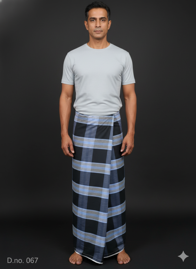 The black and blue check pattern gives this lungi a bold and confident look. It pairs well with grey or black t-shirts, making it suitable for home wear, casual outings, and relaxed evenings. Buyers searching for lungi under ₹500 or lungi under ₹200 often choose checkered designs because they remain neat and attractive even after repeated washes. This pattern is also popular among customers shopping for Nungi and Hiram in Bhiwandi textile markets.