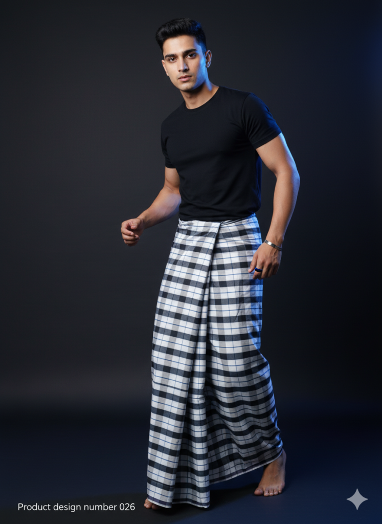 Men’s Modern Lungi – High-Contrast Black & White Plaid Design ek bold aur confident look ke saath premium comfort deliver karta hai. Black aur white checks ka sharp contrast is lungi ko modern, stylish aur instantly noticeable banata hai. Agar aap buy polyester lungi online, black white check lungi for men, ya modern lungi design India search kar rahe hain, toh Design No. 026 ek strong aur trendy choice hai.